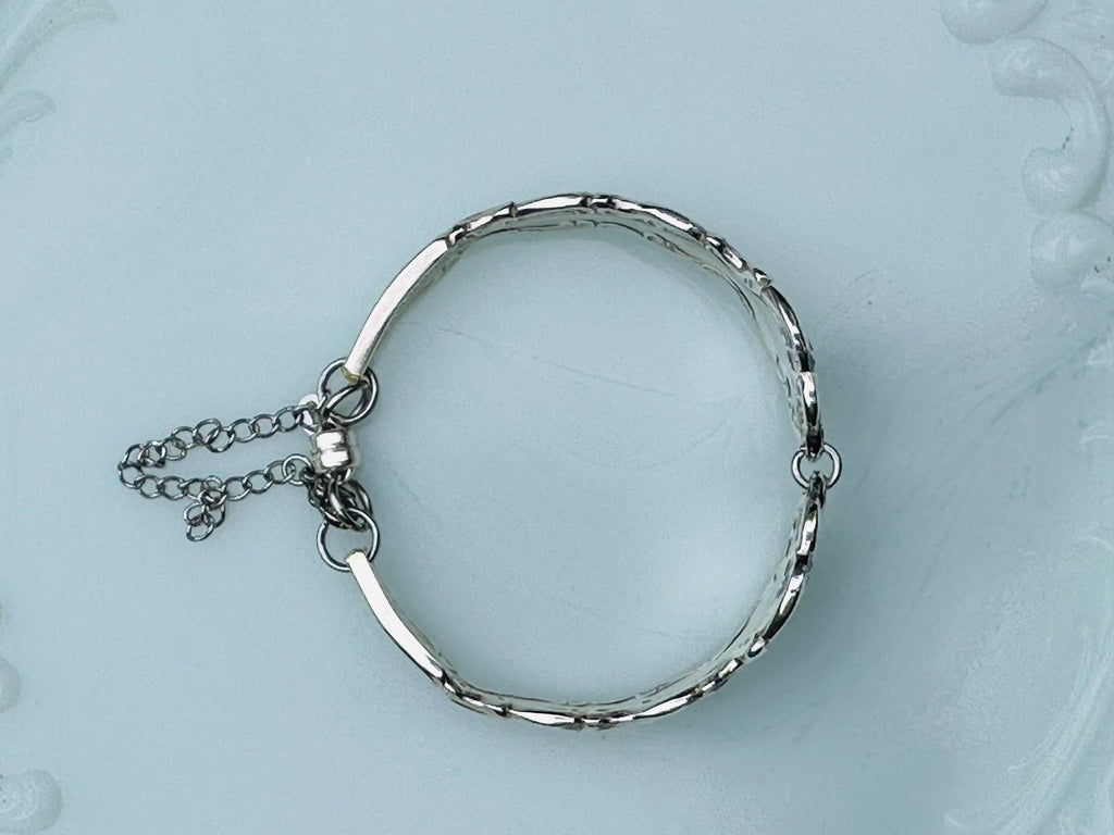 2 Piece bracelet from vintage silver-plate spoon handles with magnetic closure and stainless steel safety chain.