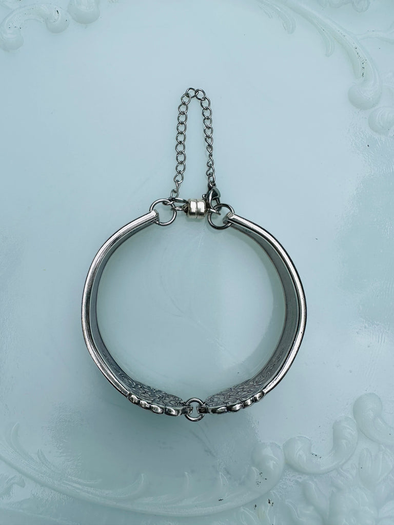 2 Piece bracelet from vintage silver-plate spoon handles with magnetic closure and stainless steel safety chain.