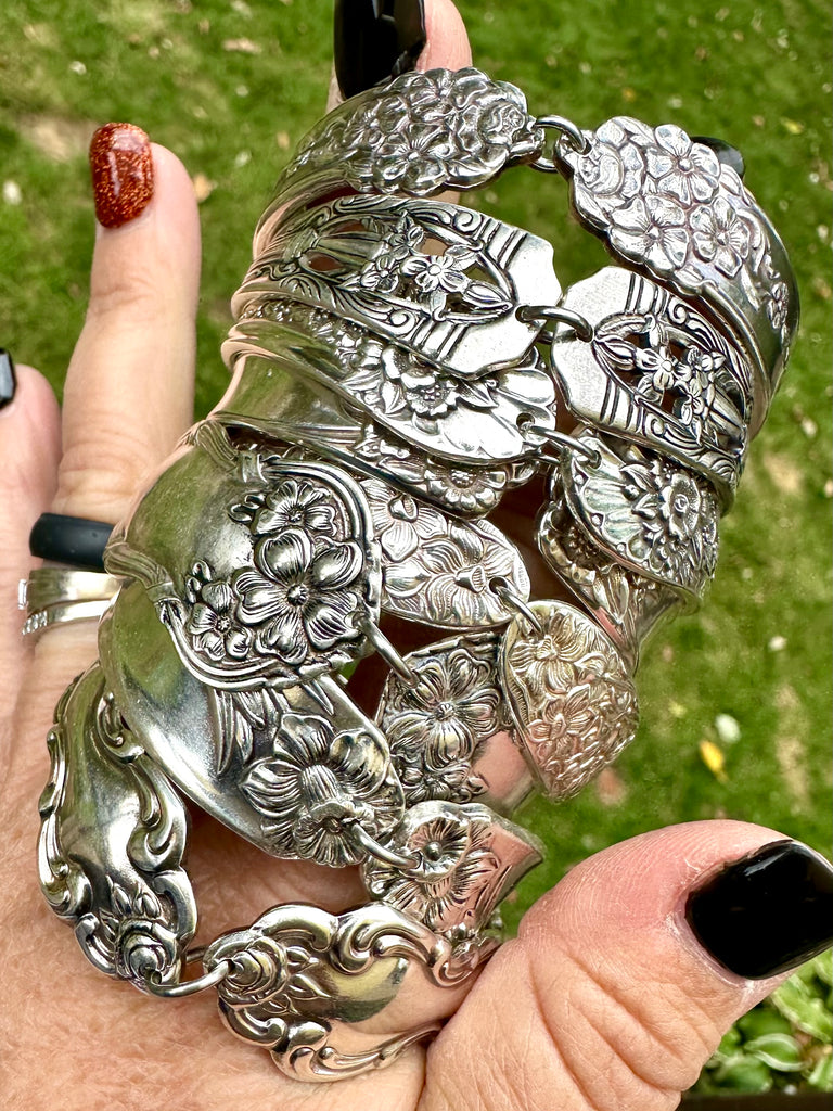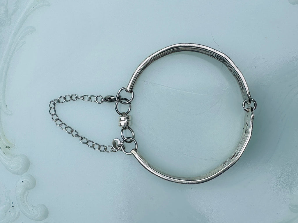 2 Piece bracelet from vintage silver-plate spoon handles with magnetic closure and stainless steel safety chain.