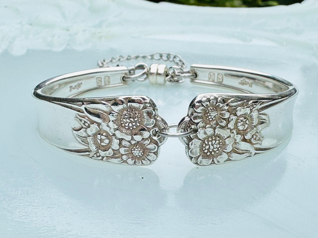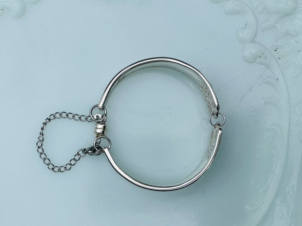 2 Piece bracelet from vintage silver-plate spoon handles with magnetic closure and stainless steel safety chain.