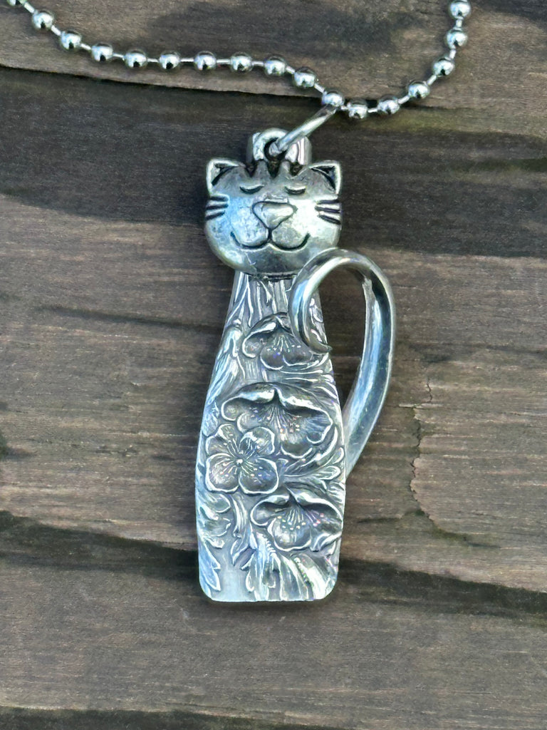 Cute cat pendant made from the handle of a vintage silver-plated spoon or fork. They have a fork tine tail soldered on and a cat face charm, held with a bit of epoxy to keep it in place. Super cute! Each one is unique, the one in the picture is the one you will receive. 30" stainless steel ball chain included.