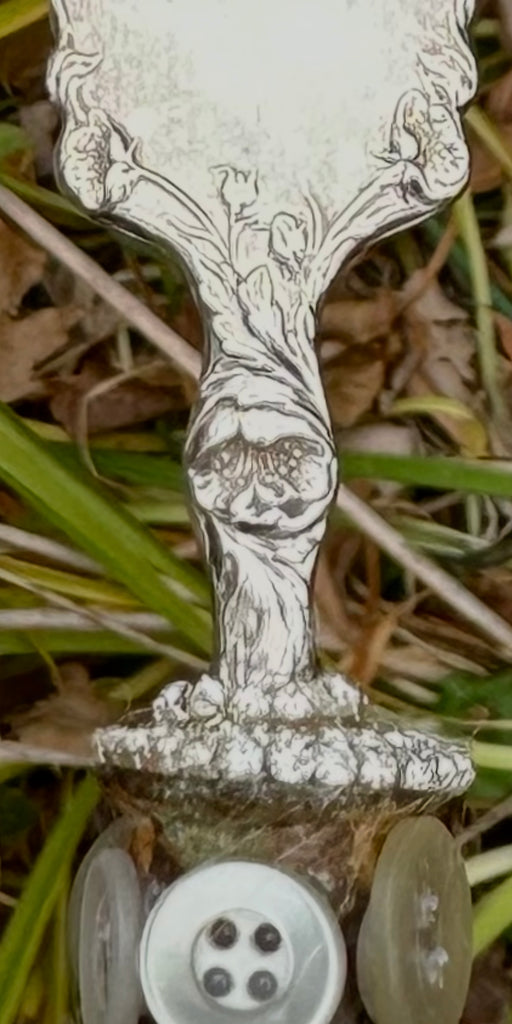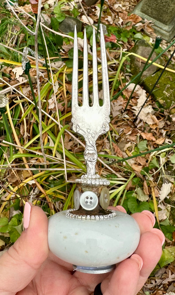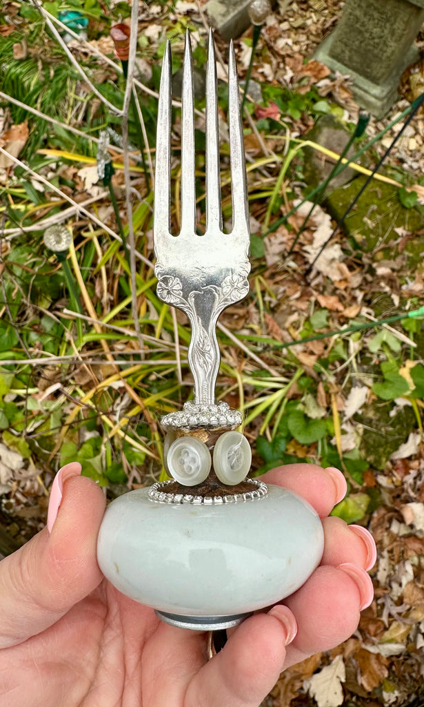 White antique  porcelain doorknob, with vintage bent fork and adornments.