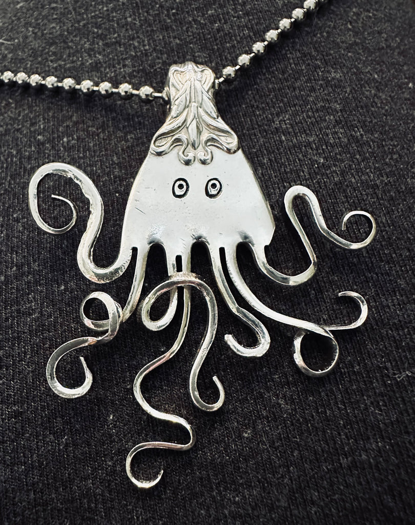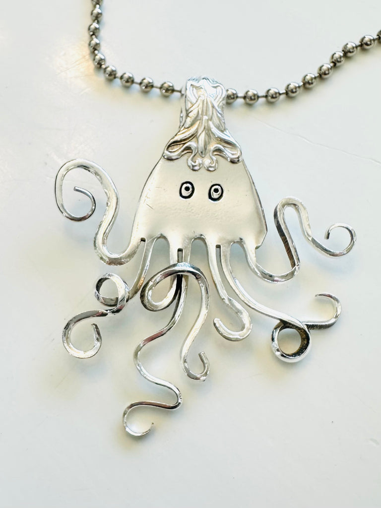 Fork octopus made from a vintage silver plate fork top. I sliced the tines and bent them. 22" Stainless steel cable chain included.