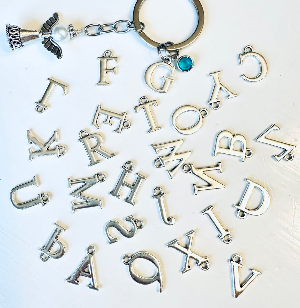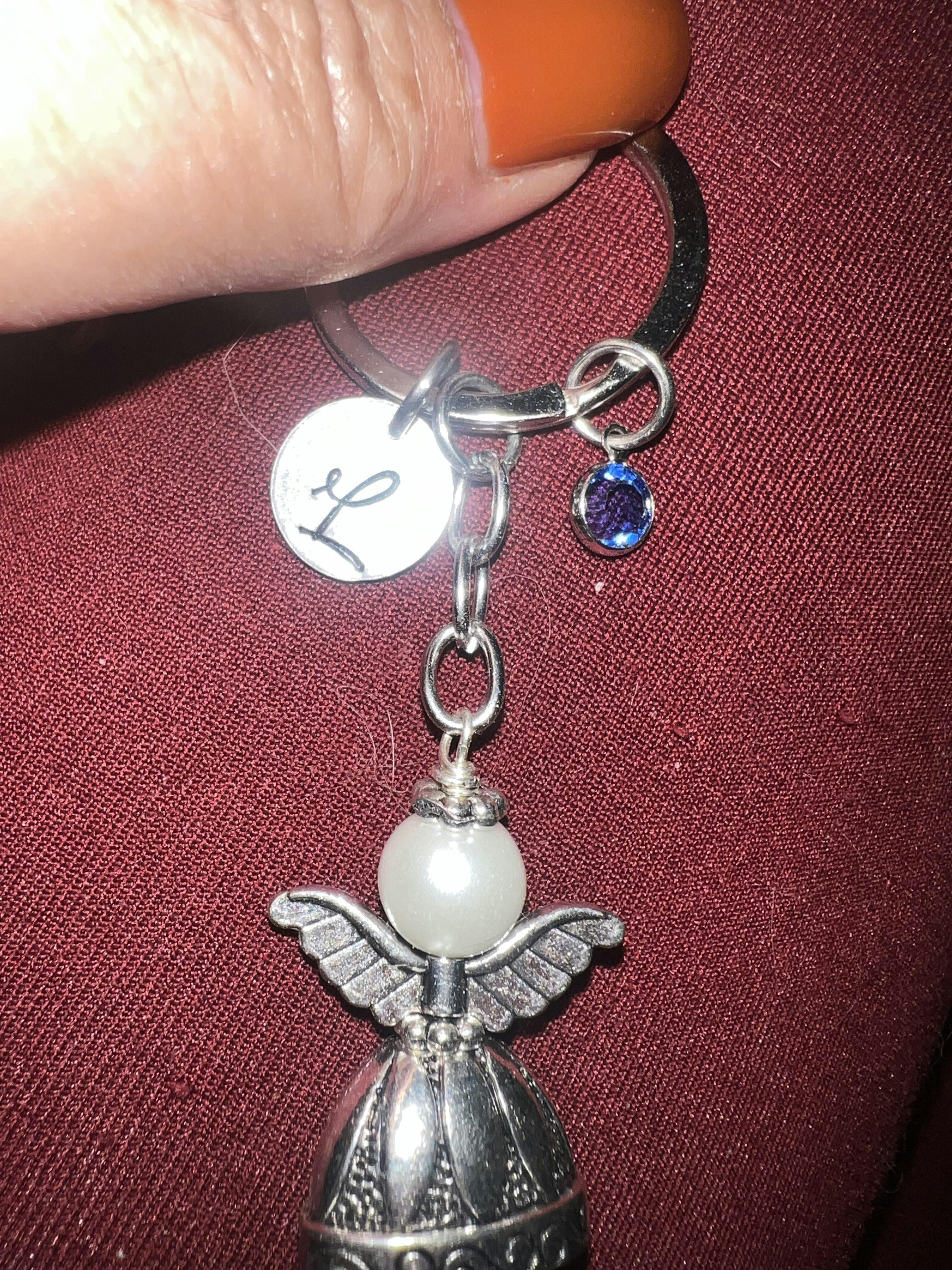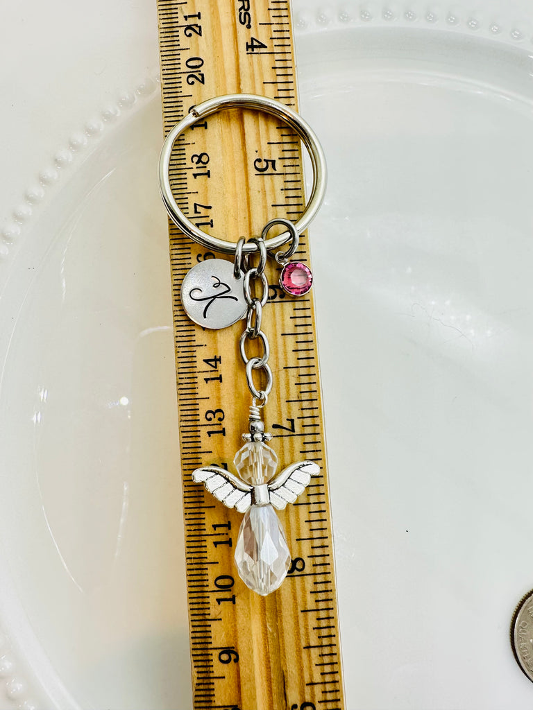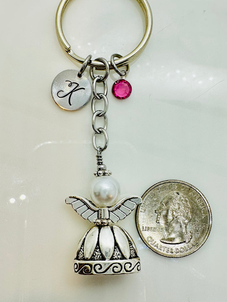 Guardian angel keychain made with a hand wired silver and pearl angel, hand stamped letter charm and your choice of ONE birthstone crystal charm.