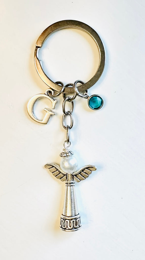 Guardian angel keychain made with a hand wired silver and pearl angel, hand stamped letter charm and your choice of ONE birthstone crystal charm.