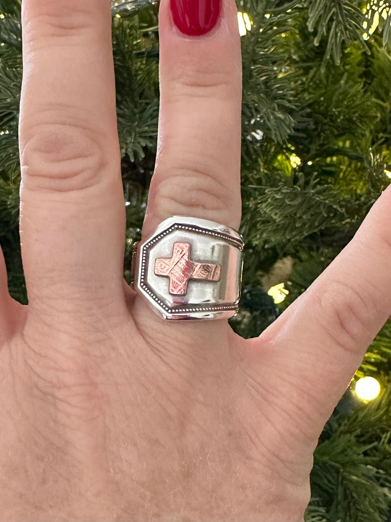 Penny Cross Spoon Ring made from a vintage silver plated spoons. I cut crosses from pennies  and solder them on.