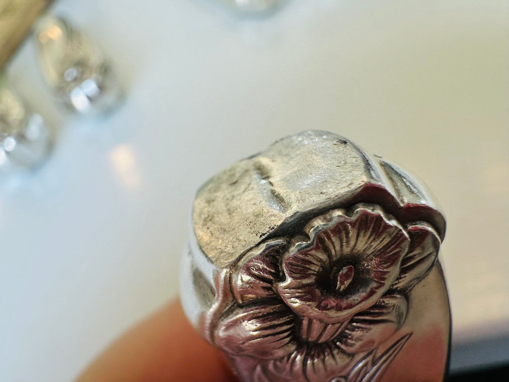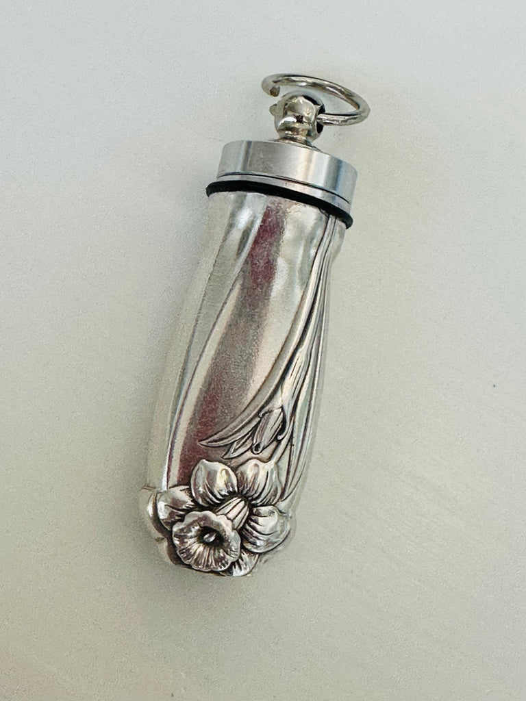 Crated from vintage silver-plated knife handles. The top unscrews for your loved ones ashes. Funnel included.