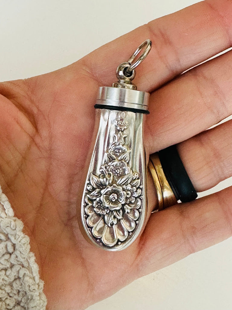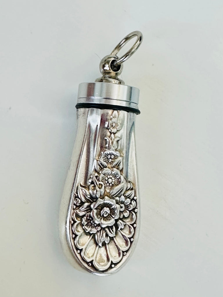 Crated from vintage silver-plated knife handles. The top unscrews for your loved ones ashes. Funnel included.