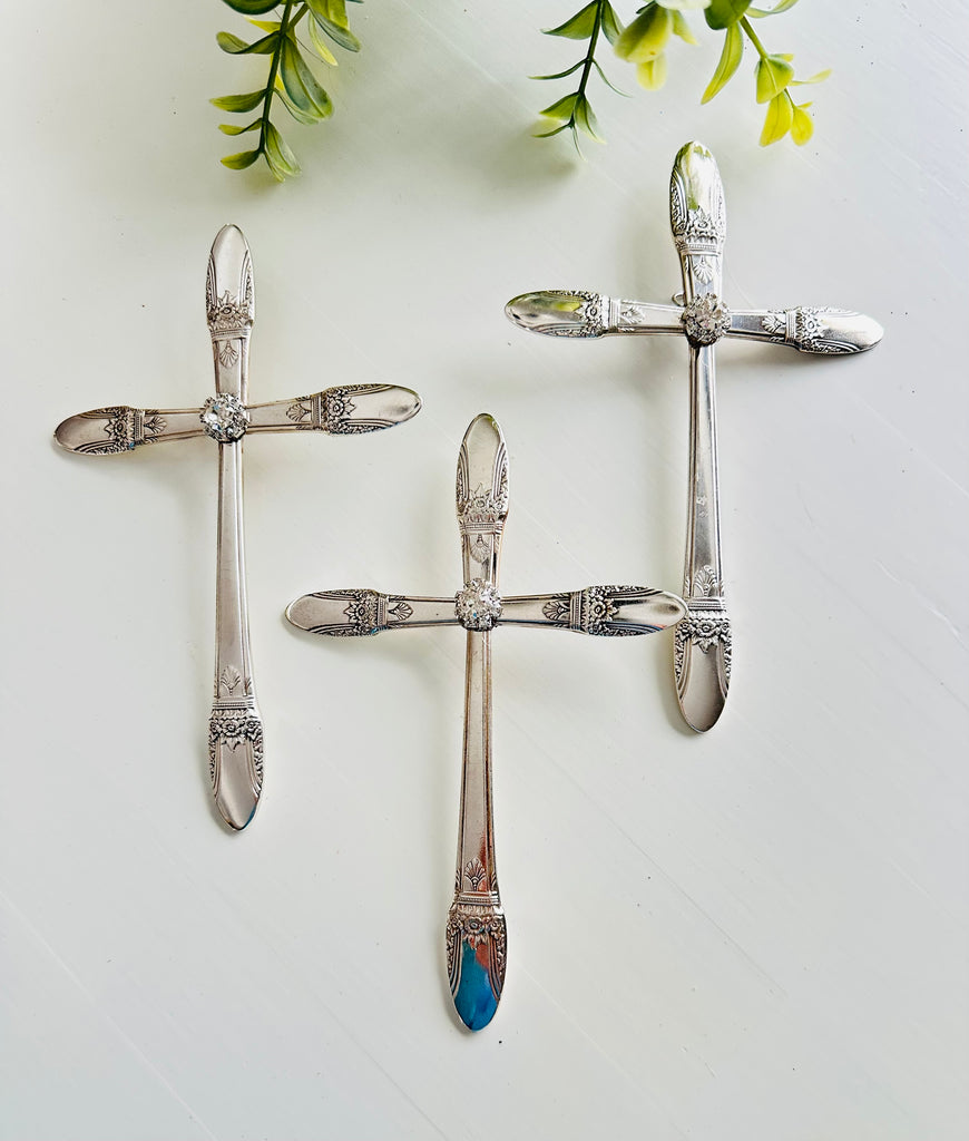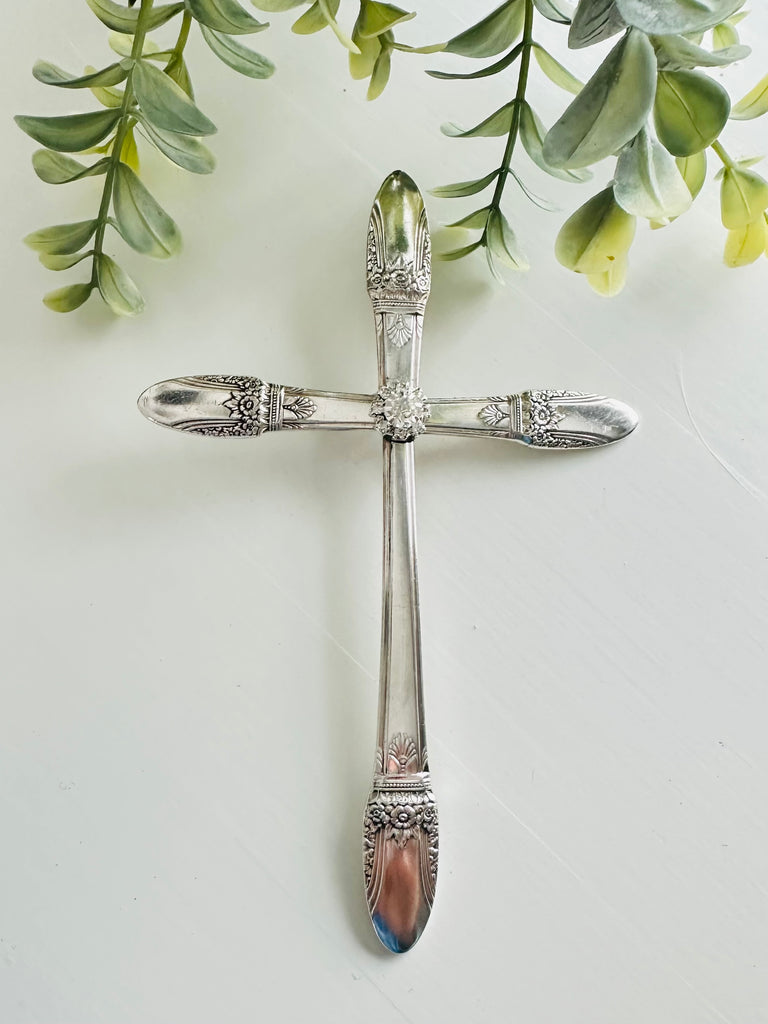 Wall cross made from 4 pieces of vintage silver-plate spoons and forks. cut and soldered together. Each one unique! They are soldered together and an adornment is epoxied on the front center to cover the solder lines. Hanger soldered to the back. They each hang around 7" x 4".