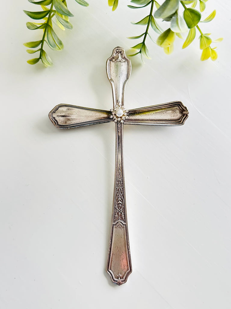 Wall cross made from 4 pieces of vintage silver-plate spoons and forks. cut and soldered together. Each one unique! They are soldered together and an adornment is epoxied on the front center to cover the solder lines. Hanger soldered to the back. They each hang around 7" x  4".